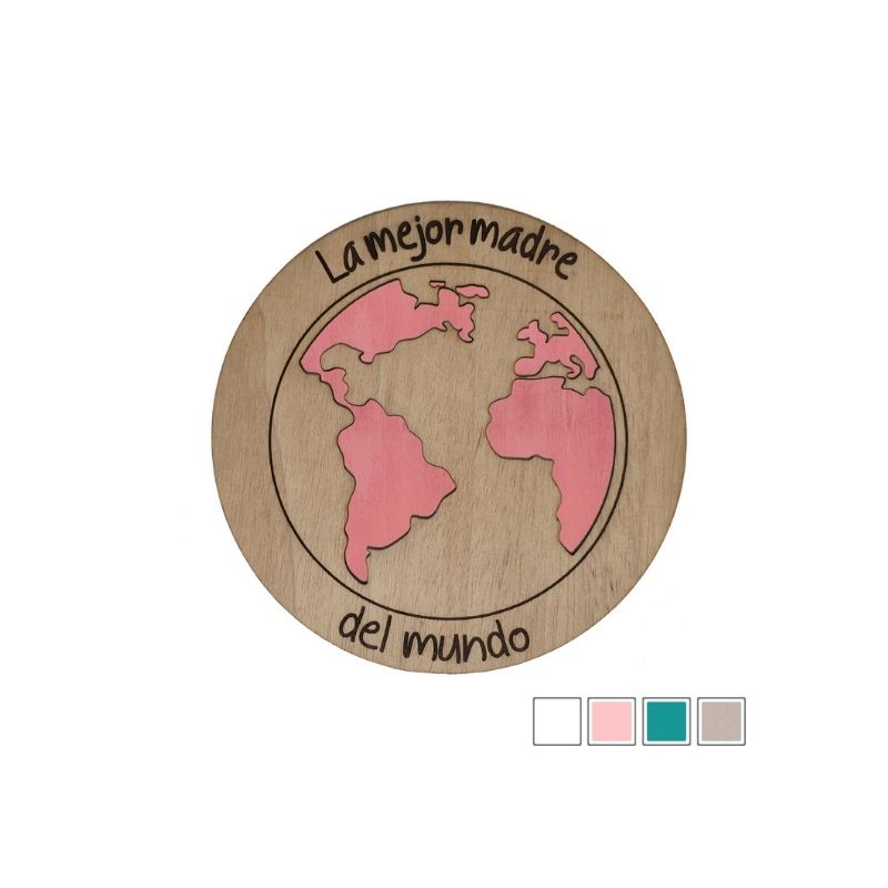 Cartel en madera natural con la frase "La mejor madre del mundo" en formato troquelado con los continentes.\n\nDedicado a esas mamás que queremos, que nos cuidan y que son tan importantes en la familia.\n\nUn cartel original como detalle para esos papas que les gustan los detalles bonitos y la decoración. Servirá para decorar cualquier rincón de casa o del trabajo y podrá presumir del gran detalle de su familia.\n\nTodos nuestros productos están realizados artesanalmente en nuestro taller, con lo que la calidad de las piezas está garantizada.\n\nEste material no pesa y en caso de querer pegarlo directamente a la pared puedes emplear adhesivo de doble cara (no incluido). Para su correcta adhesión, debes pegarlo en una superficie lisa y limpia.\n\nMedidas aproximadas: Diámetro de 20cm x 0.6 cm.
