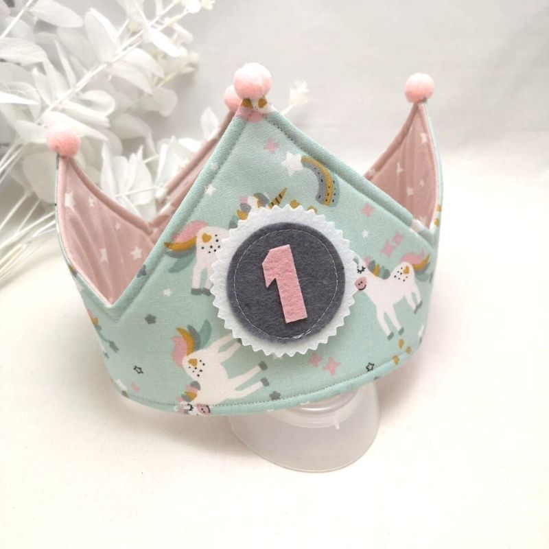 Corona de cumpleaños con estampado de unicornios sobre fondo mint y parte interior rosa con estrellas en blanco.