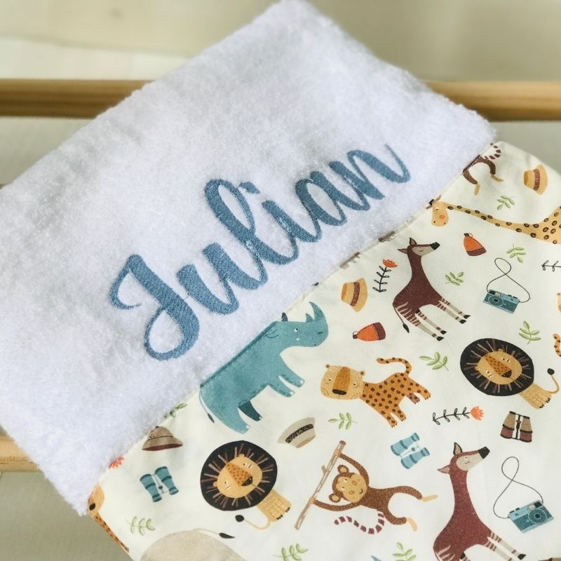 Preciosa toalla de baño personalizable, podrás elegir la tela que más te guste (Solo debes escribir en las notas del pedido que tela deseas). Encontrarás toda la variedad de telas en la galería de las fotos. Además podrás elegir la opción de bordar el nombre de tu bebé en la toalla, así tu peque tendrá una toalla exclusiva.<<Normalmente el nombre bordado va en en el tono que más le vaya a la tela, pero si prefieres algún color en concreto solo debes escribirlo en las notas. Además debes escribir en las notas el nombre de la tela que deseas>>. En la galería de imágenes podrás ver la variedad de colores para el bordado del nombre en la toalla. El rizo de nuestras toallas cumple con la normativa GOT, están elaborado con un rizo orgánico. Medidas: 120cm x 70cm. Composición: 100% algodón. Cuidados: Lavar a maquina con lavado delicado, no planchar la zona de la toalla. Artículo fabricado a mano en España. Este artículo no tiene devolución ya que es personalizado. Tiempo de confección: 15-20 días laborales aprox (Siempre que no esté en stock).